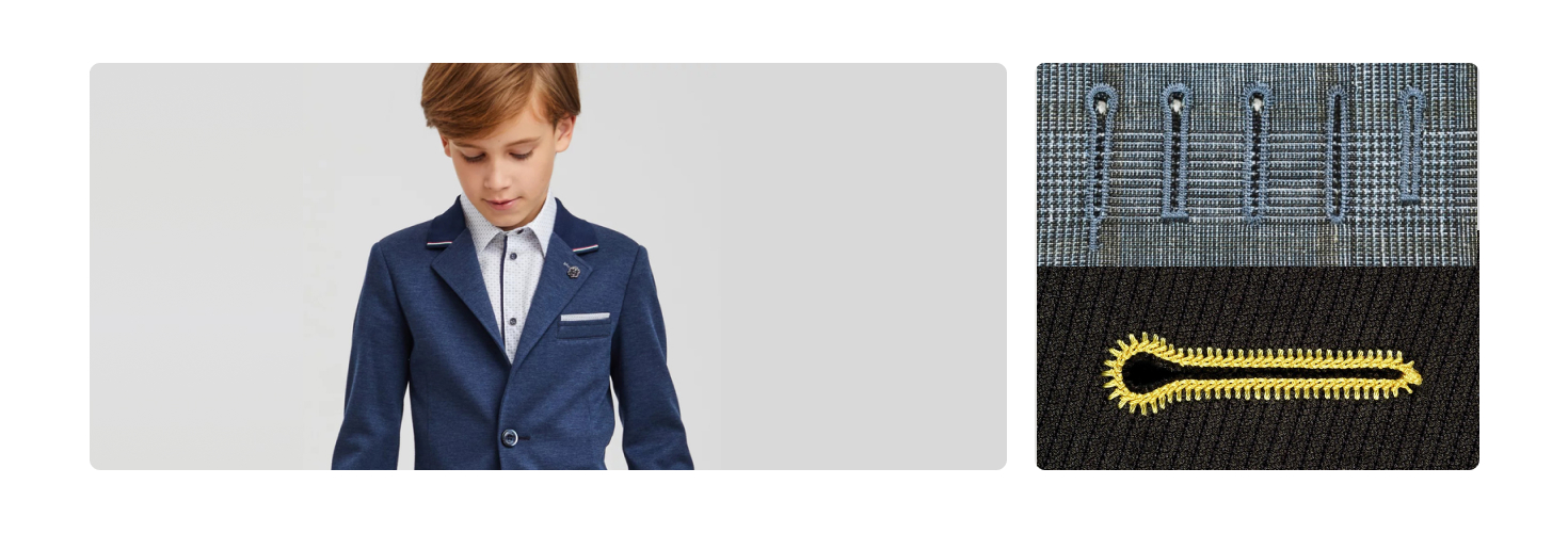 Для обметывания петель в изделиях на подкладке: пиджаках, жакетах, жилетах необходимо применять петельную машину для петель «с глазком» – Juki MEB-3200CSSMM, Siruba BH9820-02, Jack JK-T9820-02 или Red Shark RS-9820-01. Это машины с электронным управлением, память блока управления которых содержит встроенные программы обметывания петель, а также имеется возможность создавать и сохранять в памяти новые программы шитья.
